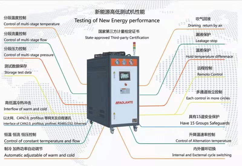 深圳奧蘭特機械新能源高低溫測試功能齊全,并且計量精度都是經(jīng)過國家第三方計量檢測機構(gòu)檢驗,并取得檢定證書。在設(shè)備的流量控制、壓力控制、溫度控制精度都媲美進口設(shè)備。奧蘭特高低溫測試機功能多樣化,,具體有分段流量控制、分段溫度控制、分段壓力控制、制冷加熱功率自動調(diào)節(jié)、自動補液、吹氣回液、漏油報警、升降溫速率控制、單系統(tǒng)多通道獨立控制,擁有強大的通訊功能:485通訊、以太網(wǎng)、MODBUS、PRPFIBUS、CAN2.0,讓設(shè)備可以便捷的和主輔設(shè)備進行通訊遠程控制。深圳奧蘭特機械于國內(nèi)外眾多的新能源汽車廠家、檢測機構(gòu)、汽車研究所都已經(jīng)進行深度合作。
